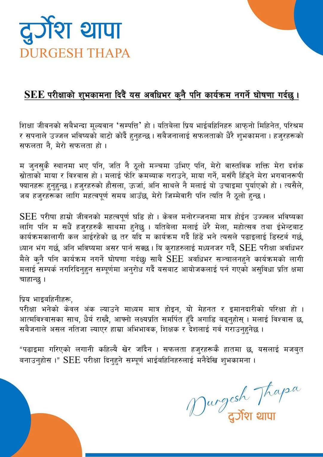 Durgesh has announced that he will not participate in any concerts during the SEE exam period. Through a social media post, he declared that he will not take part in any events during the SEE exam period starting from Thursday.